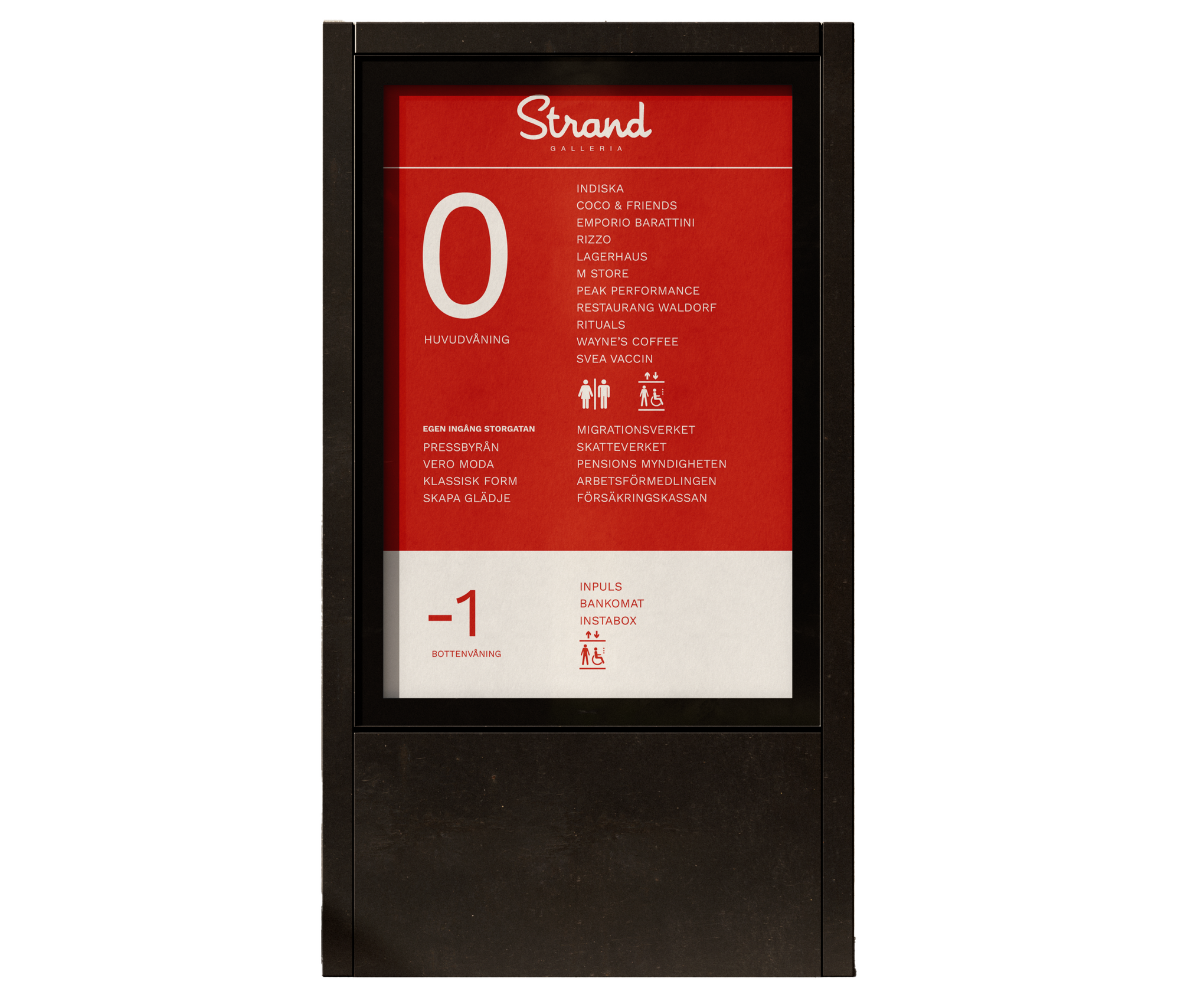 The assignment was to design a new wayshowing concept for a shopingmall. Starnd Galleria is a relatively small shoppingcenter that lacks unity and guidance.I wanted to give the shoppingcenterl a strong visual unity and clear guidance for the centers many services. I worked with the shoppingmalls graphic profile to develop new signs and informationboards that stand out in the shoppingcenter.